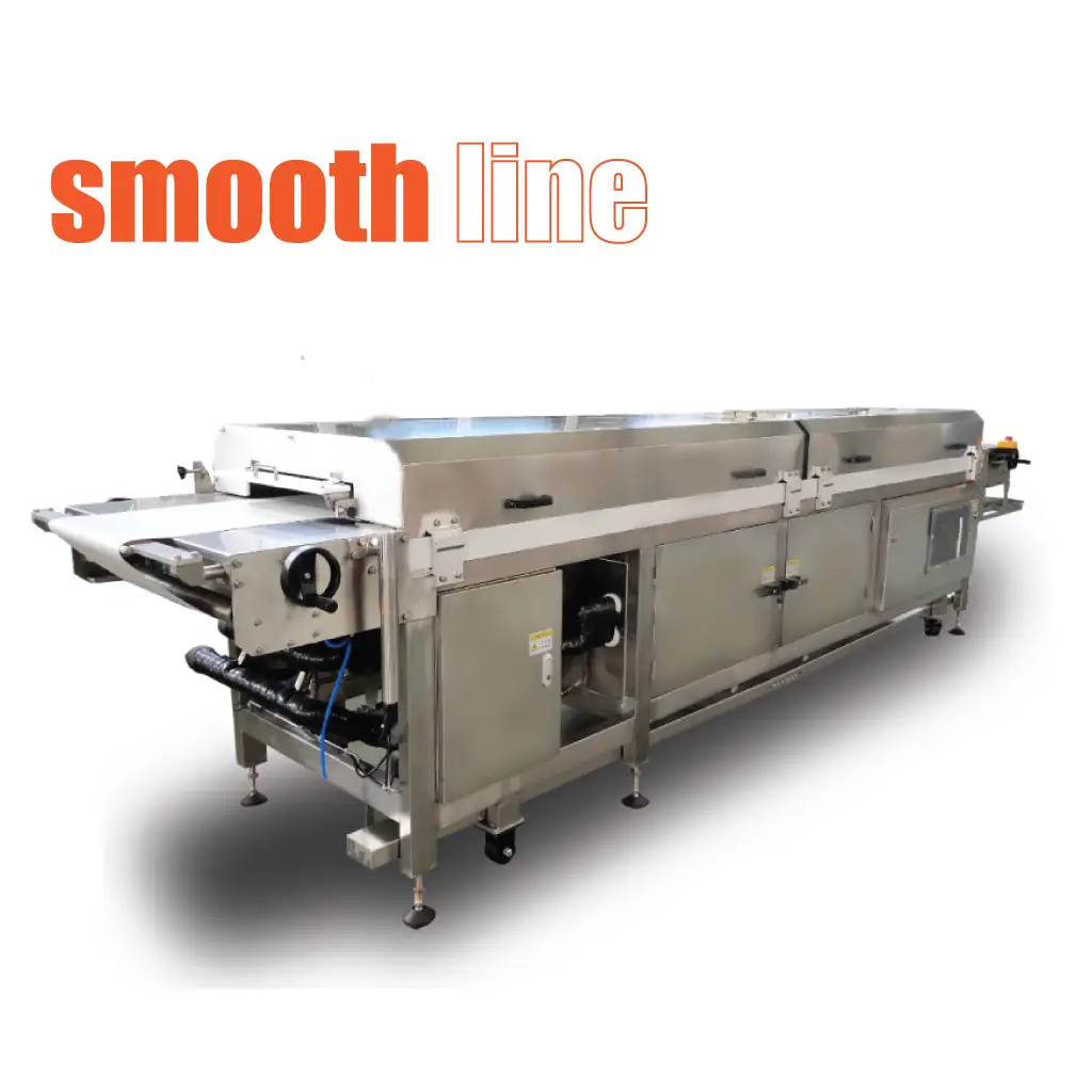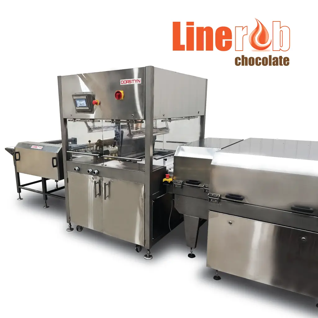 Dark or white chocolate. The cooling tunnel cools the coating for final packaging or for the next process.